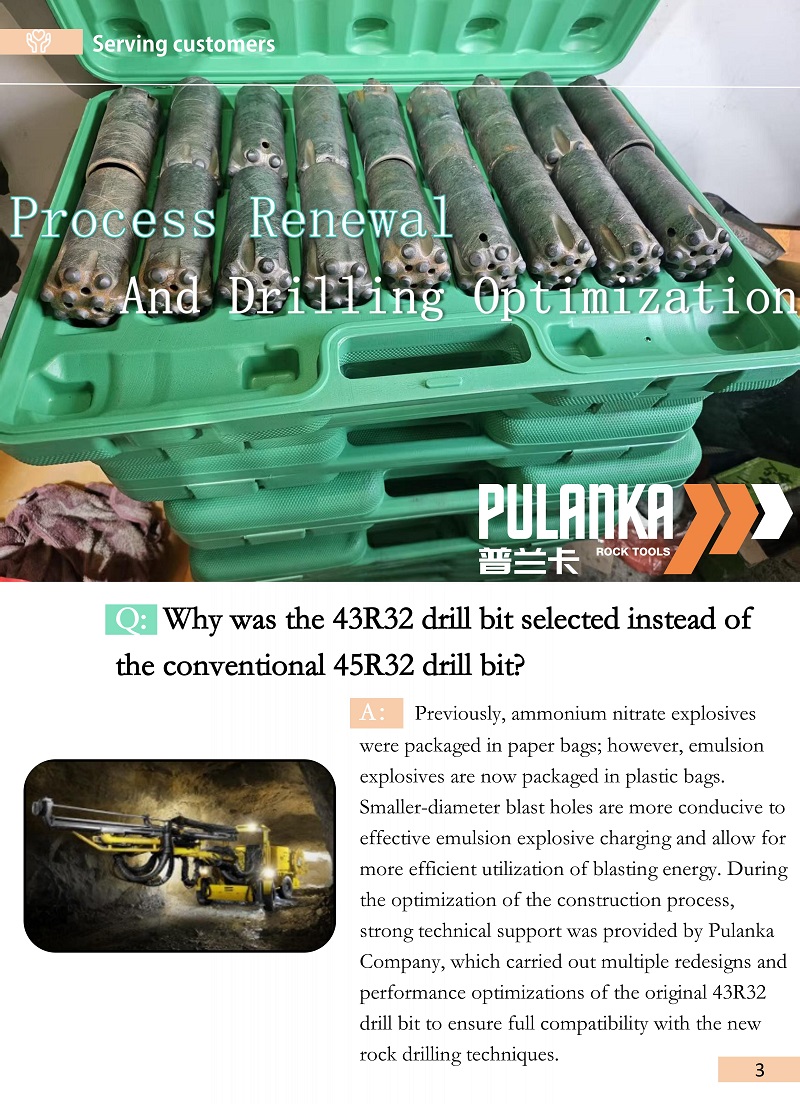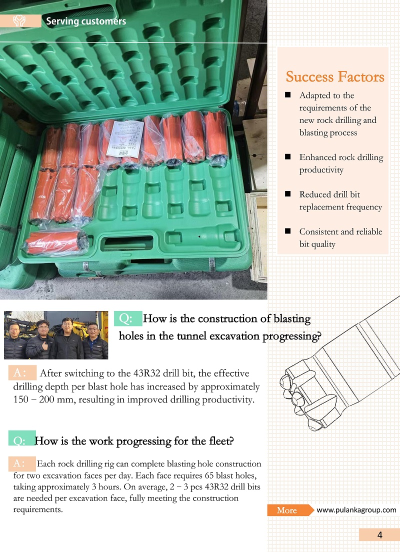 Ergebnisse: Nach der Umstellung auf den 43R32-Bohrmeißel hat sich die effektive Bohrtiefe pro Sprengloch um etwa 150–200 mm erhöht, was zu einer verbesserten Bohrproduktivität führt. Jedes Gesteinsbohrgerät kann den Sprenglochbau für zwei Ausbruchflächen pro Tag durchführen. Jede Wand erfordert 65 Sprenglöcher, was etwa 3 Stunden dauert. Im Durchschnitt werden pro Baugrube 2–3 Stück 43R32-Bohrer benötigt, um den Bauanforderungen voll und ganz gerecht zu werden.